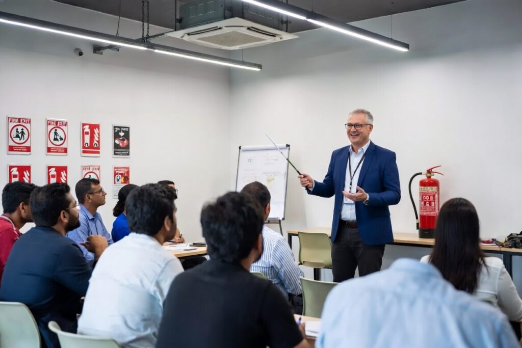 This comprehensive Fire Safety Awareness and Fire Warden course equips participants with essential knowledge and practical skills to prevent fires, respond confidently in an emergency, and protect lives and property. Participants will gain a clear understanding of the fire triangle, fire prevention strategies, common workplace fire hazards, fire safety legislation, and correct emergency procedures including raising the alarm and safe evacuation. A key highlight of the course is the hands-on practical training, where delegates practise using different types of fire extinguishers (Water, Foam, CO₂, and Dry Powder) on live fire simulations. This ensures participants develop real confidence in selecting the correct extinguisher and applying the correct firefighting techniques. Delivered as a classroom-based course only to maximise interaction, group discussions, and practical extinguisher training. Highly recommended for all employees, and essential for nominated Fire Wardens, Fire Marshals, and Health & Safety Representatives.